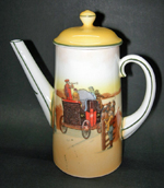 This is a rare shape Royal Doulton coffee pot decorated in the coaching days pattern. It came with cans & saucers dated 1925 so I assume it dates to the same period. Excellent condition with no chips, cracks or repairs. Price: AU365.00