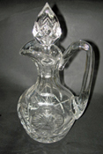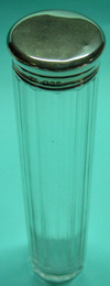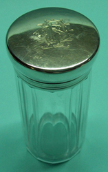 This is a good quality, cut crystal container with a sterling silver cover. It is a bit unusual in that it was made with a hole in the base and has a metal insert inside to cover this. Assayed in London with the date letter code for 1926, maker's mark "GC & S" and it has been monogrammed. It is 3 1/2 inches (9 cm) high by 11/2 inches (3.8 cm) in diameter. Good condition with no chips cracks or repairs. Price: AU$85.00 |
