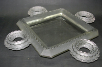 A Lalique, France, frosted glass bowl with large ring handles to the sides. It is marked with the engraved "Lalique France" signature to the side & would date to around 1980. There are a few very minor chips to the underside of two of the rings that are of no great significance, otherwise it is in good condition with no other chips, cracks or repairs. It measures 34 cm square including the rings and is 5 cm high. Price: AU$995.00
