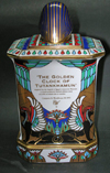 A Compton & Woodhouse, England ceramic cased, battery operated clock "The Golden Clock of Tutankhamun" that dates to the 1990's It measures 25 cm high by 13.5 cm wide at the base and is in good condition with no chips, cracks or repairs. The clock has a new battery fitted and is in good working order.