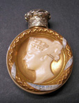 A Royal Worcester perfume bottle made for Queen Victoria's Golden Jubilee in 1887. It features her "young head" on one side and the floral emblems of England, Scotland & Wales together with the names of some of the countries of the British Empire at the time including India and Australia on the other. It has a silver cover that is not hallmarked probably because it is mixed metals for the screw thread. It is just over 1 inch (3 cm) in diameter and has a small chip on the "India" garland near the top on the reverse side. Otherwise it is in good condition with no other chips, cracks or repairs. Price: AU$850.00