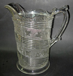 A large size clear glass jug or pitcher decorated with an ivy pattern and with a shaped top rim. In great condition with no chips, cracks or repairs, it measures 9 inches (22.9 cm) high at the spout by 5 inches (12.7 cm) maximum diameter. Price: AU$95.00