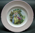 A Shelley, England cabinet plate with a idyllic lovers scene surrounded by a pink border. It would date to around 1950. It is in good condition with no chips, cracks or repairs and measures 10 3/4 inches (27.3 cm) in diameter. Price: AU$ 85.00