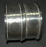 A pair of Sterling silver serviette or napkin rolls with a Fleur de Lis design and unengraved circular panel. They are hallmarked for Birmingham 1915 and maker's mark "R.P." Both are in good condition with no dings, tears or repairs. Price: AU$150 pr