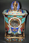 A Compton & Woodhouse, England ceramic cased, battery operated clock "The Golden Clock of Tutankhamun" that dates to the 1990's It measures 25 cm high by 13.5 cm wide at the base and is in good condition with no chips, cracks or repairs. The clock has a new battery fitted and is in good working order.